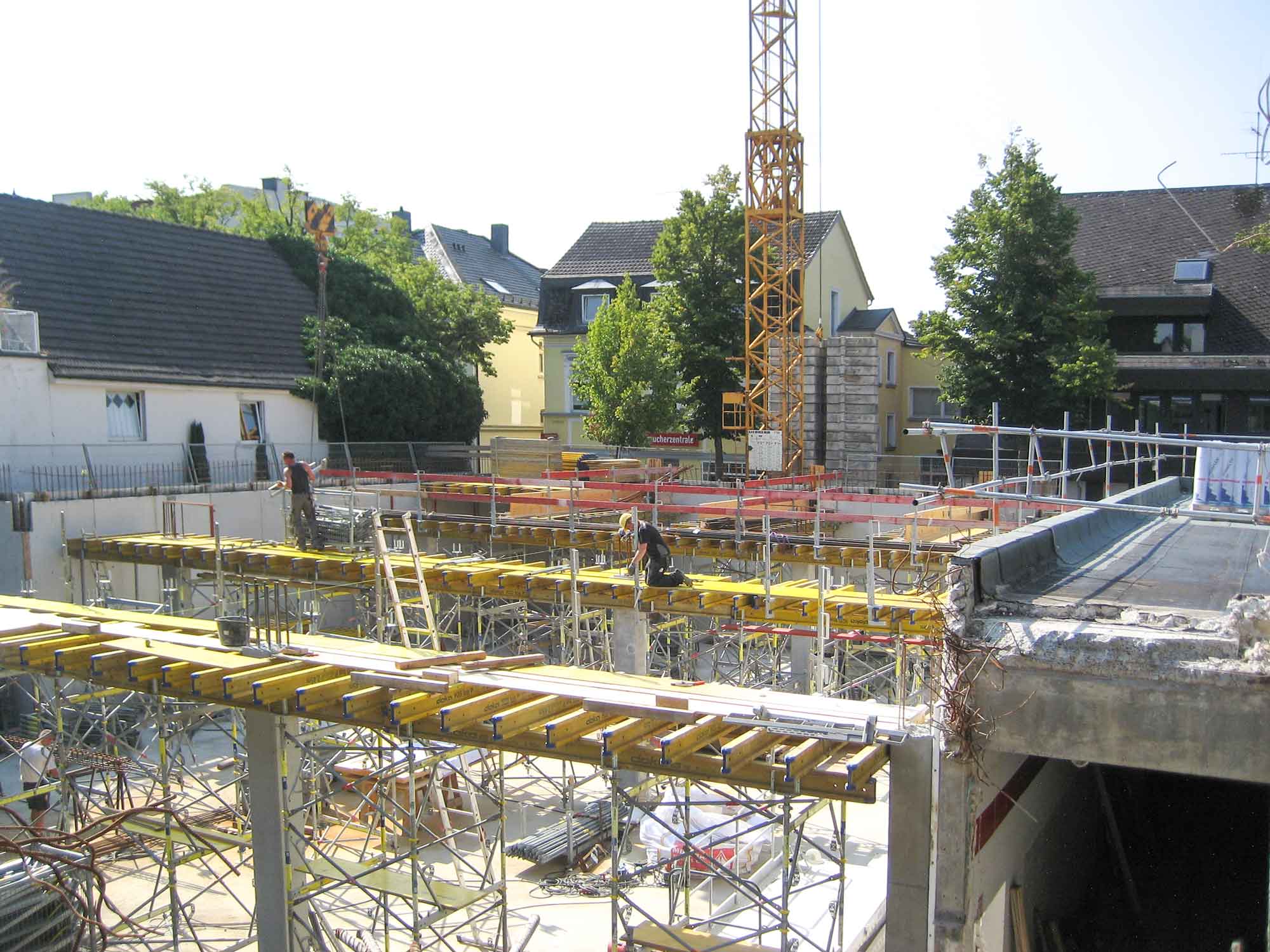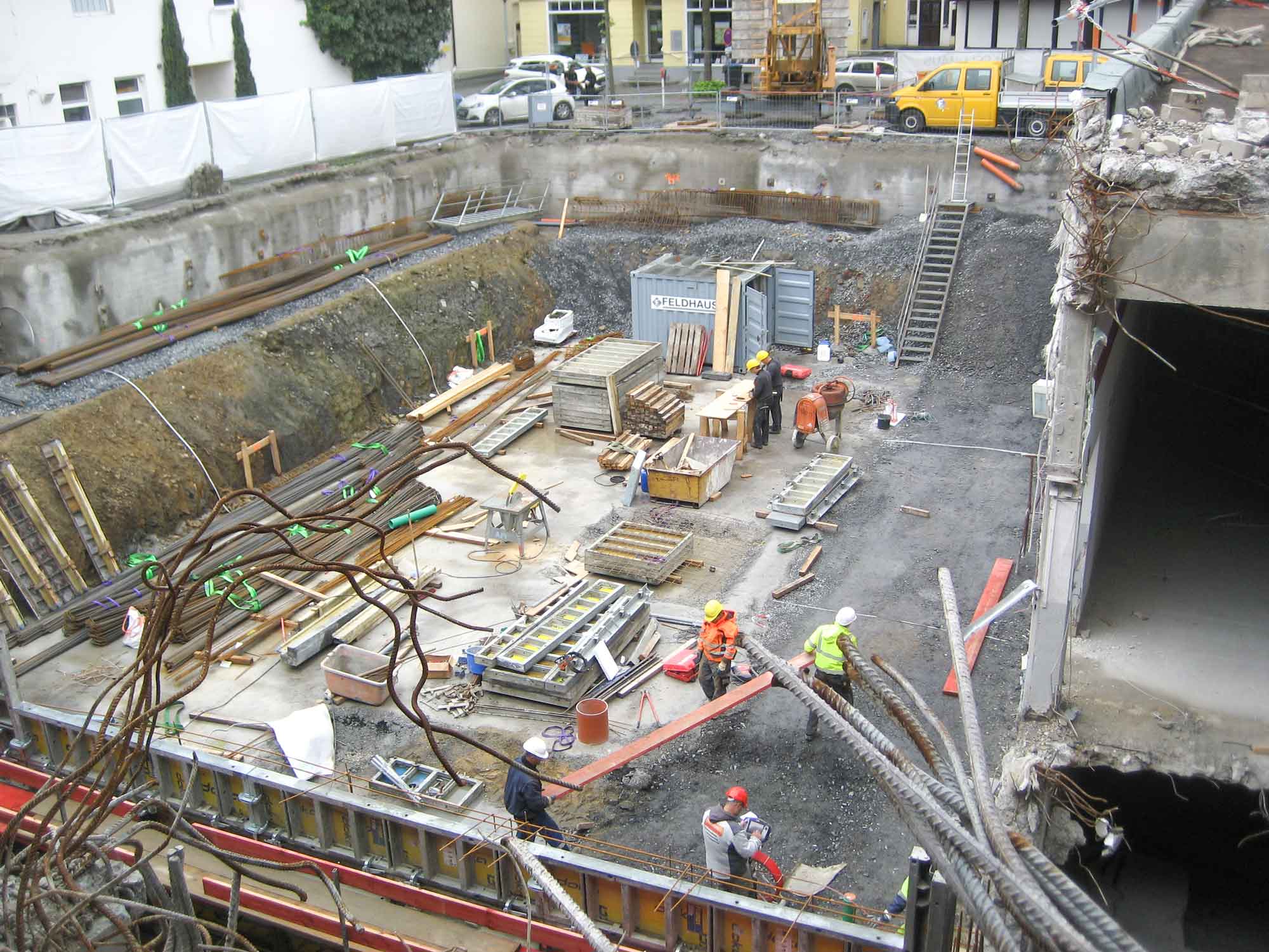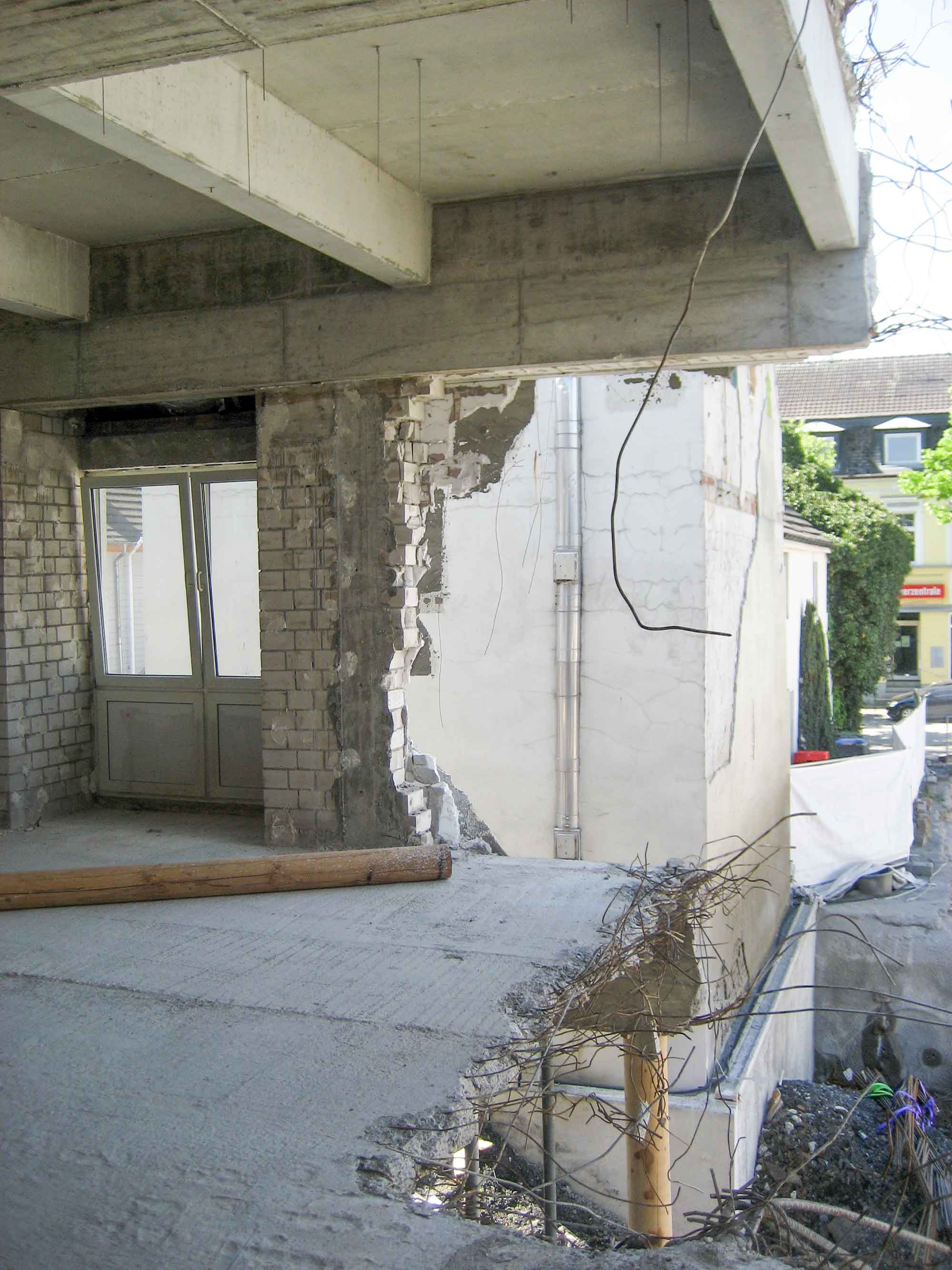 Die Stahlbetonkonstruktion des Wohn- und Geschäftshauses aus dem Baujahr 1986 / 1987 besteht im unteren Geschoss aus einem Parkdeck. Das Untergeschoss ist mit einem Ladengeschoss und Wohn- Bürogeschossen überbaut. Die Lasten werden im Wesentlichen über Stb.-Stützen mit Einzelfundamenten und Stb.- Wände mit Streifenfundamenten abgetragen. Das Bauwerk wurde seinerzeit in 5 Bauteilen (BT 1, 2, 3A, 3B, 4) erstellt.