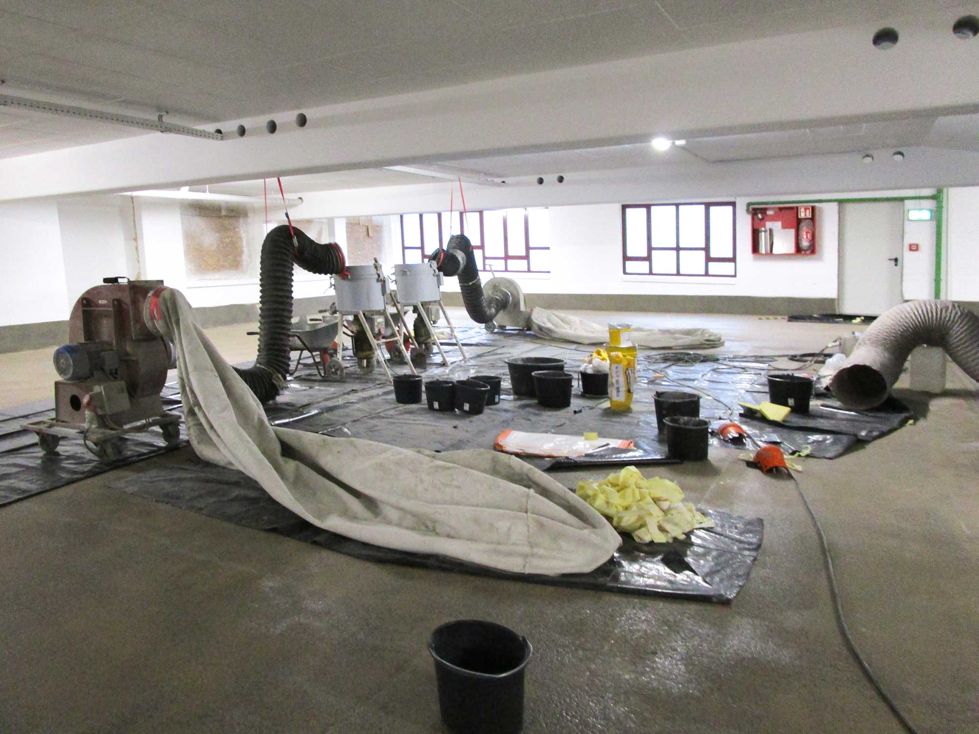 Die Betondecken wurden damals mit einem Bitumenemulsionsestrich versehen. Es wurde festgestellt, dass in den schadhaften Bereichen bzw. Flickstellen dieses Belags eine Chloridbelastung des Deckenbetons und der Wand- und Stützensockel besteht. Der schadhafte Beton wurde mittels Hochdruckwasserstrahltechnik entfernt und entsprechend geltenden Regelwerken reprofiliert. Bereits geschädigte Bewehrungen in den Bauteilen wurden ersetzt.