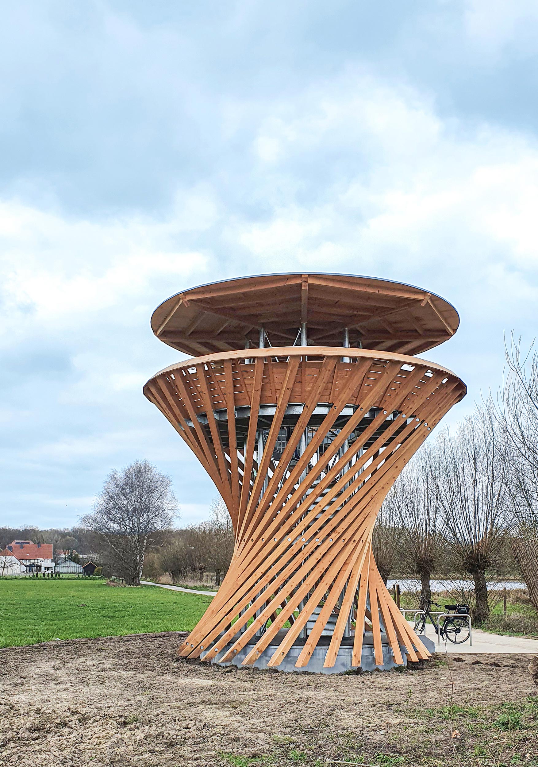 Die rundherum schräg angebrachten Holzbalken verkleiden die Konstruktion in Form einer Sanduhr.