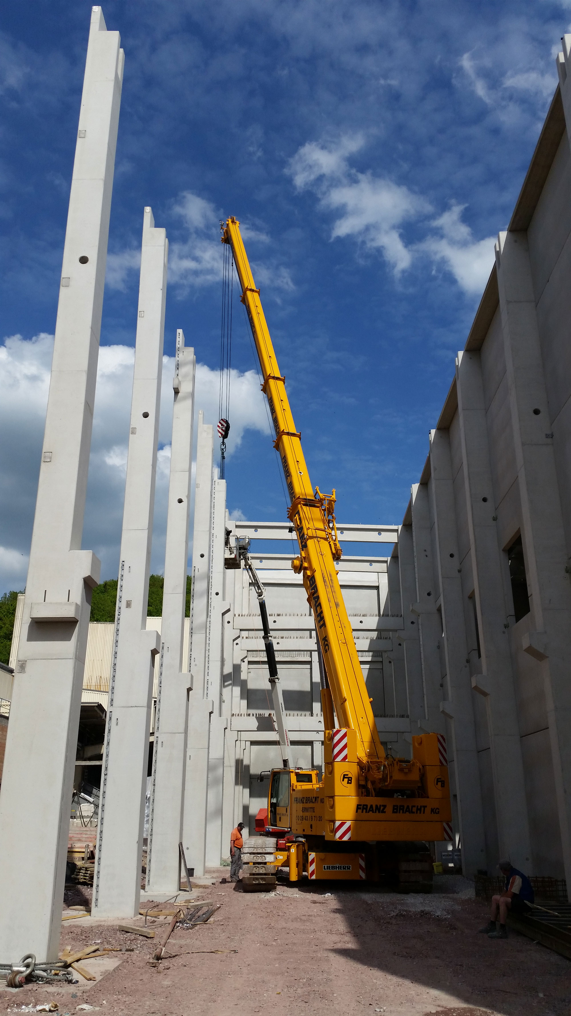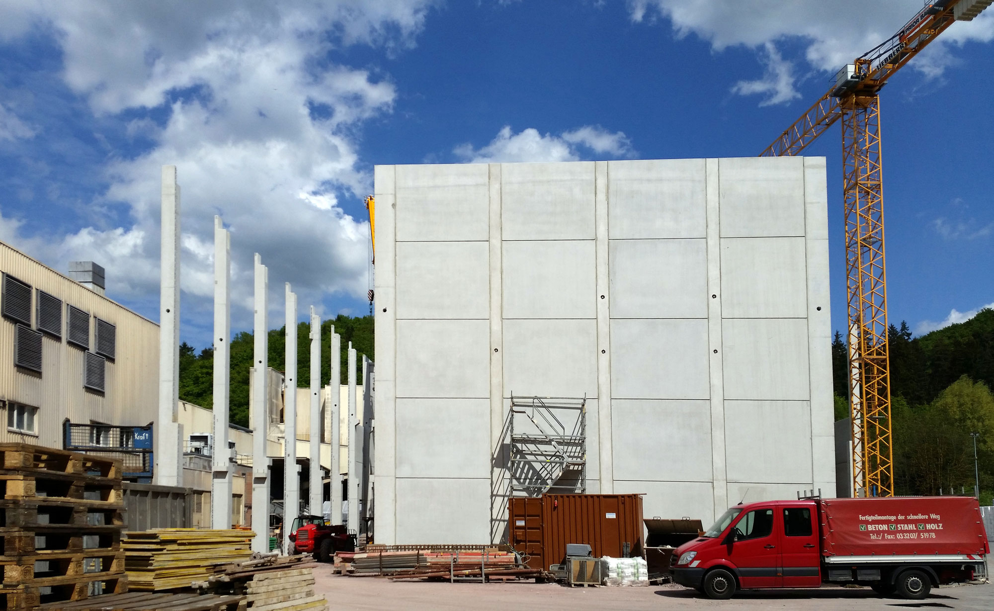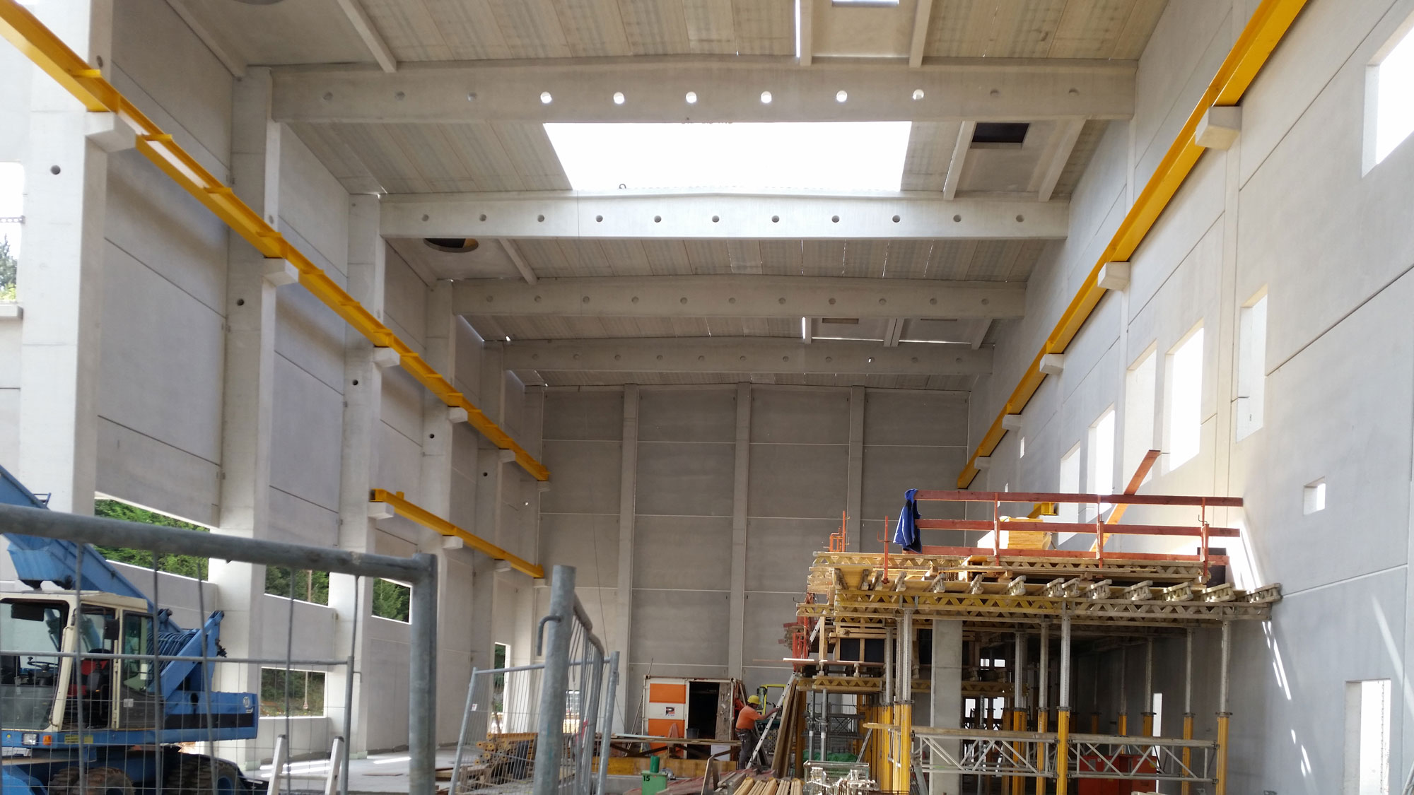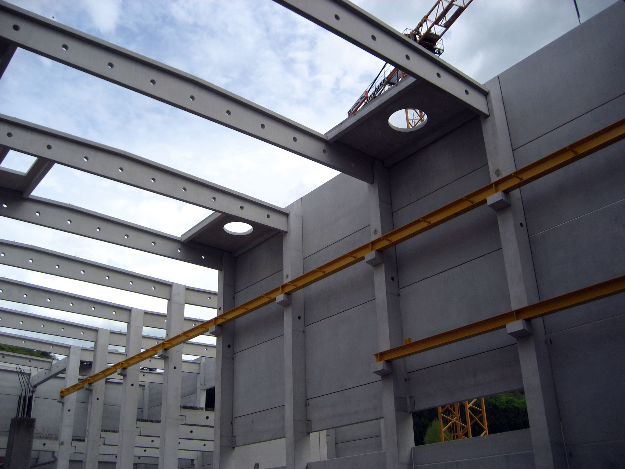 Das Hallentragwerk besteht aus vorgespannten- bzw. schlaff bewehrten Stahlbetonfertigteildachbindern sowie eingespannte Fertigteilstützen mit angeformten Fundamenten. Zusätzliche Belastungen resultieren aus mehrere Kranbahnanlagen im Hauptschiff sowie verschiedene Behältergründungen. Besonderheiten bei diesem Bauvorhaben waren die kurze Bauzeit und die teilweise baubegleitender Ausführungsplanung der Maschinentechnik.
