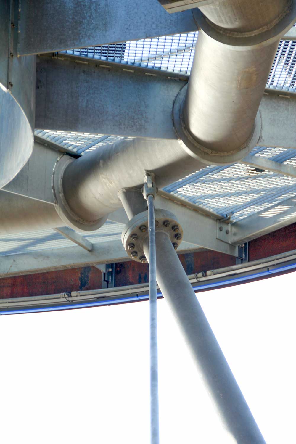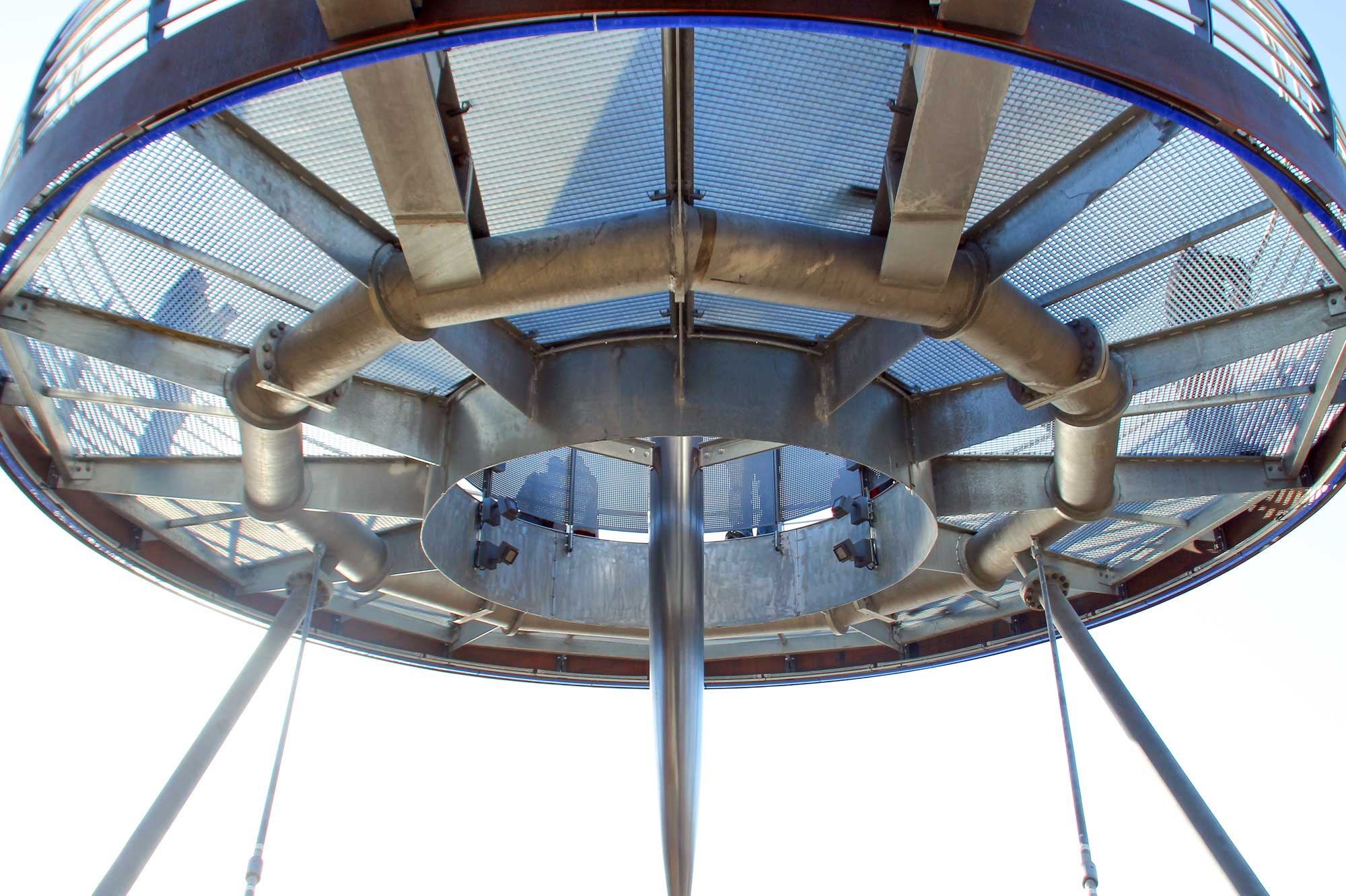 Aus transporttechnischen Gründen wurde die gesamte Stahlkonstruktion in vier Teilen angeliefert und örtlich zusammengebaut. Im Zentrum der Plattform ist eine ca. 9.00 m hohe ‚Nadel‘ eingebaut.